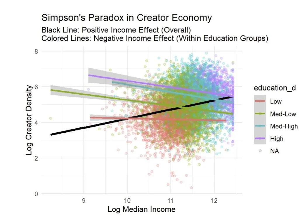 Aggregate income appears to attract creators, but within education groups, higher income consistently reduces creative participation.