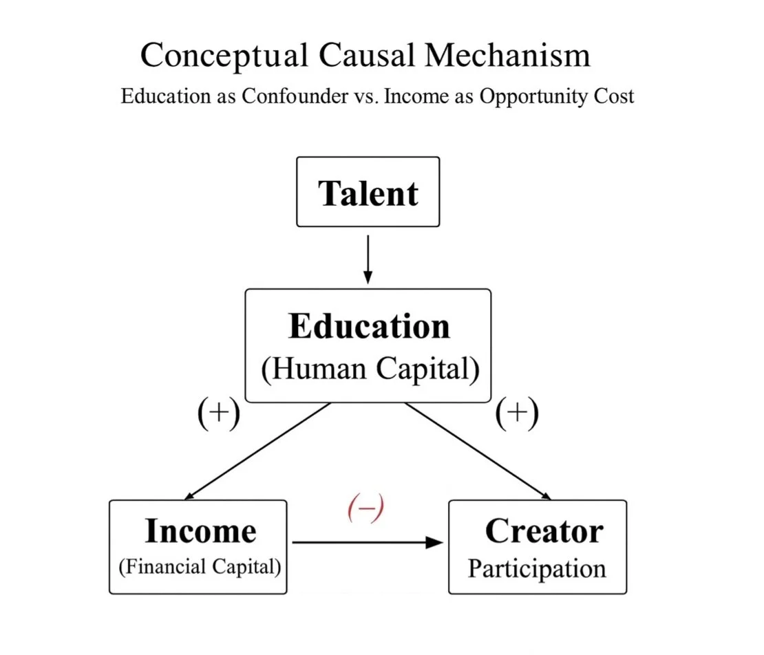 Education drives both income and creative capability, while income increases opportunity cost and crowds out creative labor.
